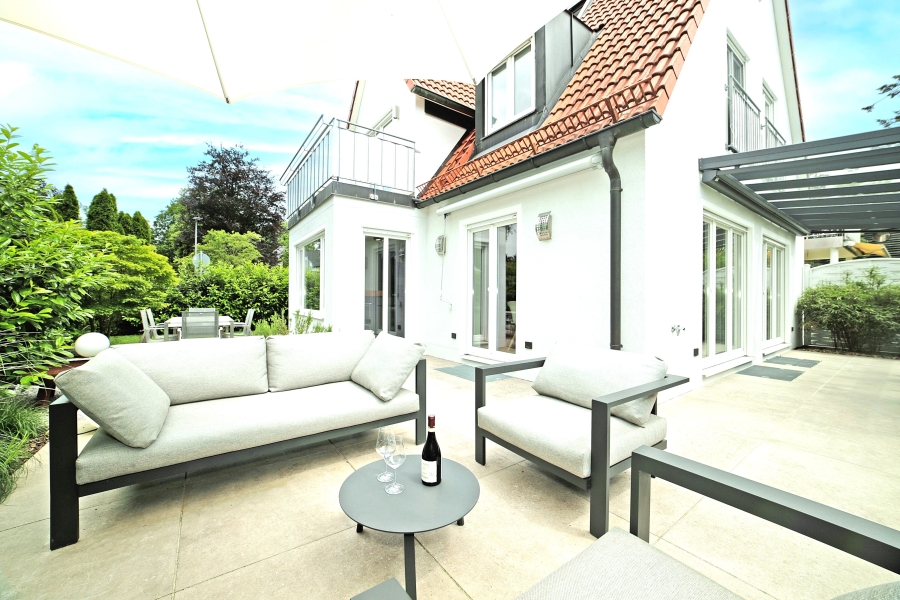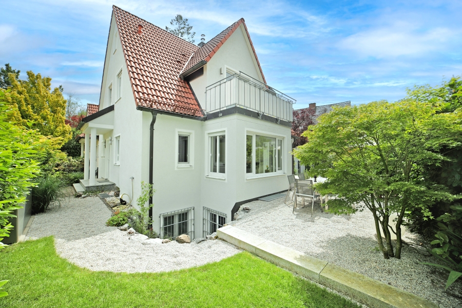 Die Doppelhaushälfte bietet einen uneinsehbaren, schön angelegten, eingewachsenen Garten mit 2 Terrassen in Süd-Westausrichtung, auf einem idyllisch und ruhig gelegenen Eckgrundstück, in hervorragender Lage von Gräfelfing.