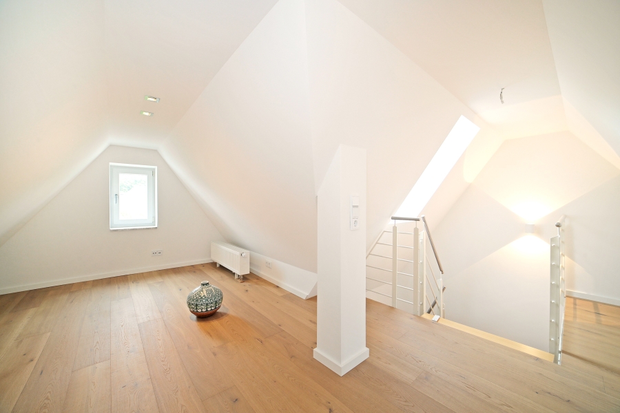 Das Haus wurde mit edlen, massiven Eichendielen ausgestattet und verfügt in allen Geschossen über eine Fußbodenheizung, außer im Dachstudio.
