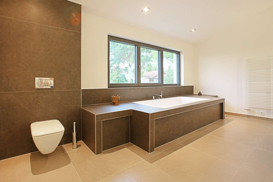 OG Wellnessbad mit Regenkopf-Dusche, XXL-Badewanne und Sauna: Bodenbelag aus Feinsteinzeug, 80 x 80 cm