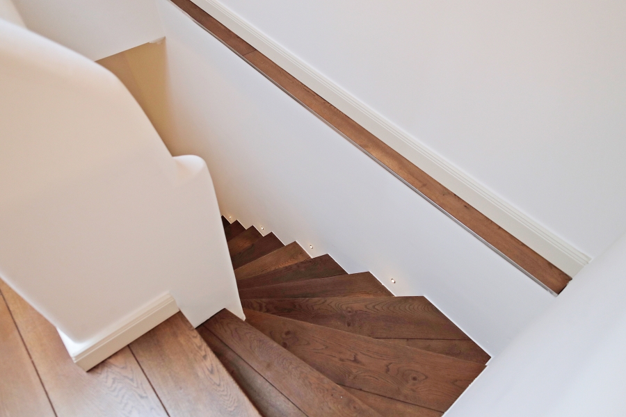 Über die Treppe gelangt man in den oberen, hellen Schlaf- und Wohnbereich, der über ein goßes Dachfenster mit viel Tageslicht versorgt wird.