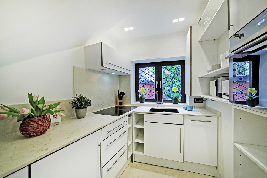 - hochwertige weiße Einbauküche mit Induktionskochfeld und integriertem Dunstabzug