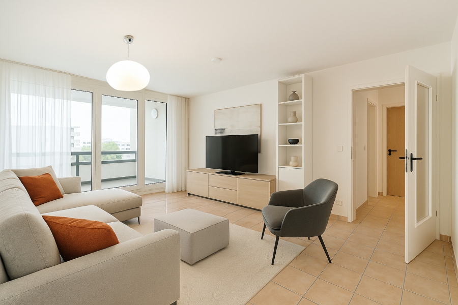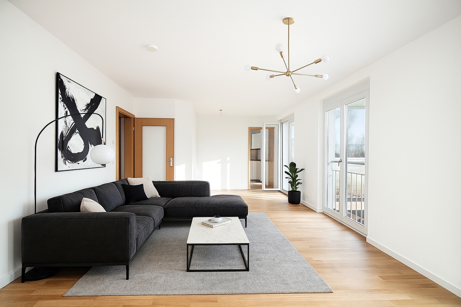 Das Herzstück dieser schönen Wohnung bildet der beeindruckend lichtdurchflutete Wohn - und Essbereich, der mit zwei sonnigen Balkonen in der begehrten Süd - und Westausrichtung und mit bodentiefen Fenstertüren besticht. Hier kann man ganztägig die Sonne genießen.