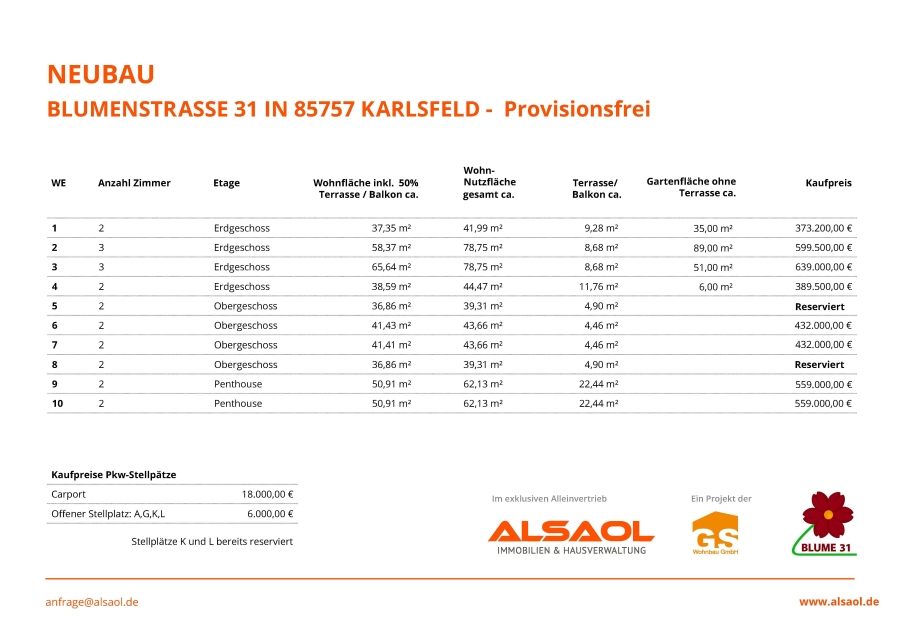 Als Alternative zum Carport besteht die Möglichkeit einen offenen Außenstellplatz zu erwerben: Kaufpreis 6.000,-- €