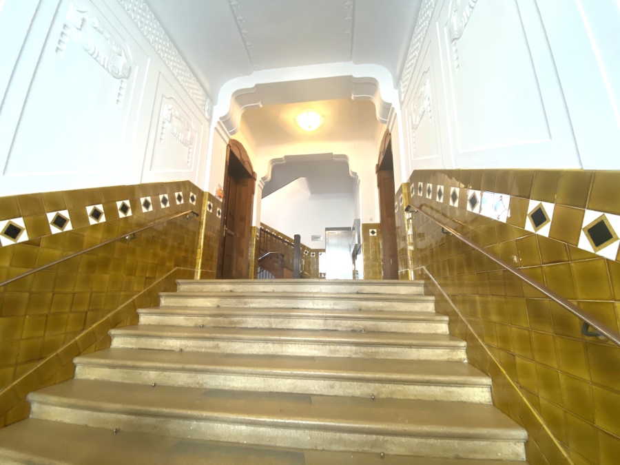 Bereits beim Betreten des Jugendstil-Wohnhauses beeindruckt das imposante, historische Treppenhaus, mit originalen Stuckelementen.