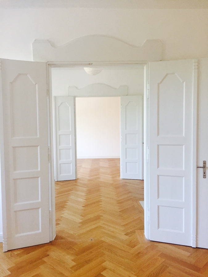 Die erlesene Wohnung besticht durch eine Raumhöhe von etwa 3,30 Metern, massives Eichen-Fischgrätparkett, charmante originale Stuckrosetten an den Zimmerdecken und besonders eindrucksvolle Flügeltüren welche im klassischen Enfilade-Stil den drei aufeinander folgenden Räumen Tiefe und Großzügigkeit verleihen und einen freien Durchblick vom ersten bis zum letzten Zimmer ermöglichen.
