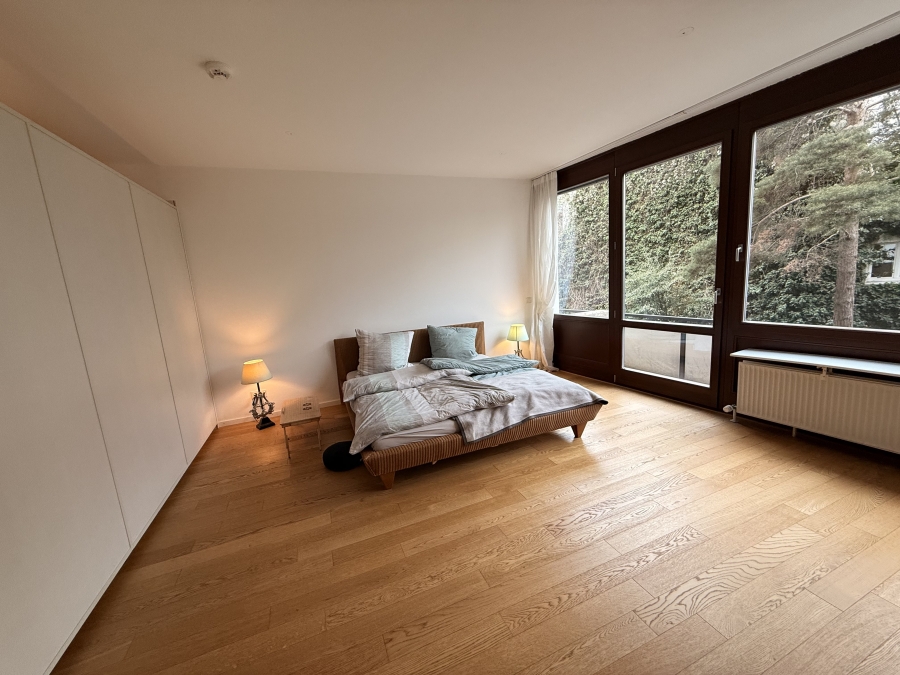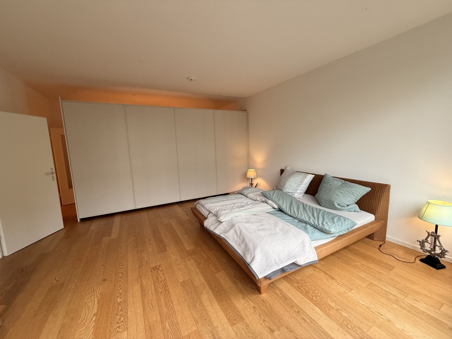 Das geräumige Schlafzimmer ist mittels eines fast raumhohen Einbauschrankes, der auch als Raumtrenner dient, optimal aufgeteilt. Dadurch wurde ein weiterer kleiner Raum geschaffen, der als Ankleide oder auch Büro dienen kann.