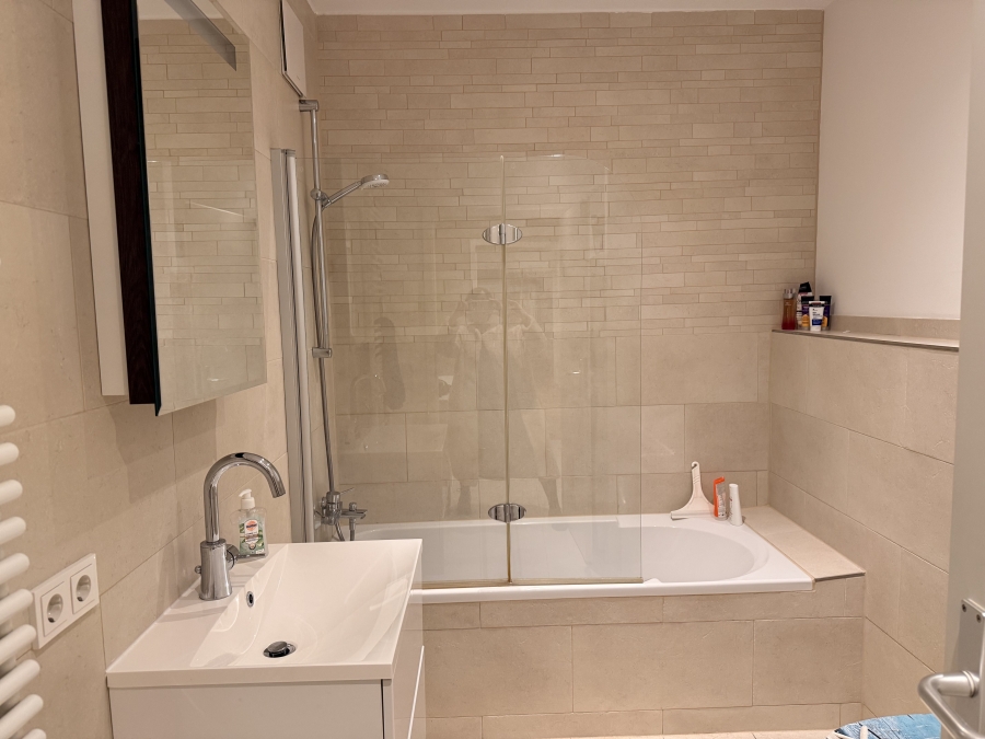 Das Badezimmer verfügt über eine Duschwanne mit Echtglasabtrennung und Platz für Waschmaschine und Trockner. Es ist mit zeitlosen beigen Fliesen ausgestattet.