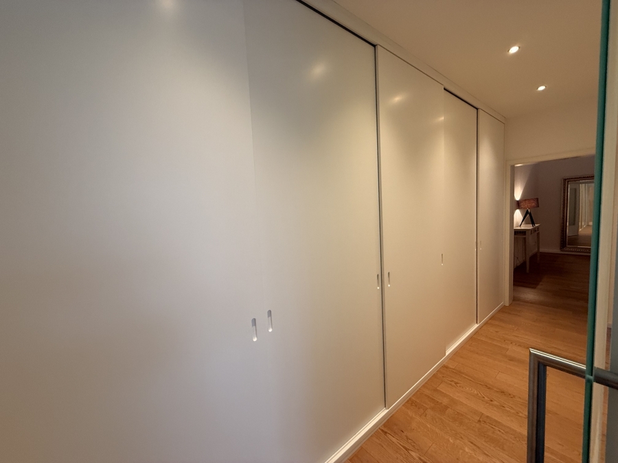 Die Wohnräume sind mit edlen Eichendielen ausgestattet. Im Flur befindet sich ein weiterer matt-weißer, maßgefertigter Einbauschrank der weiteren Stauraum bietet.