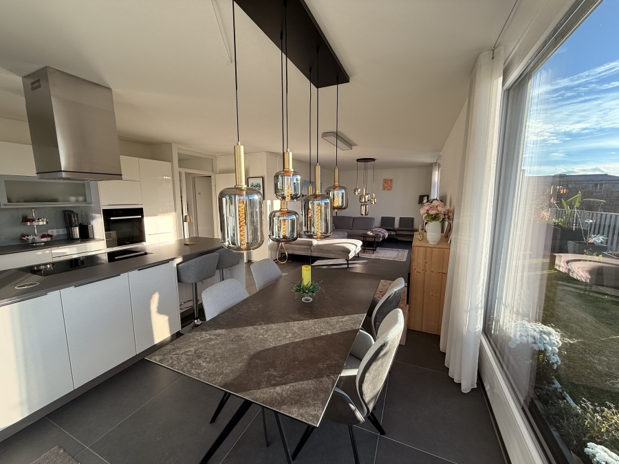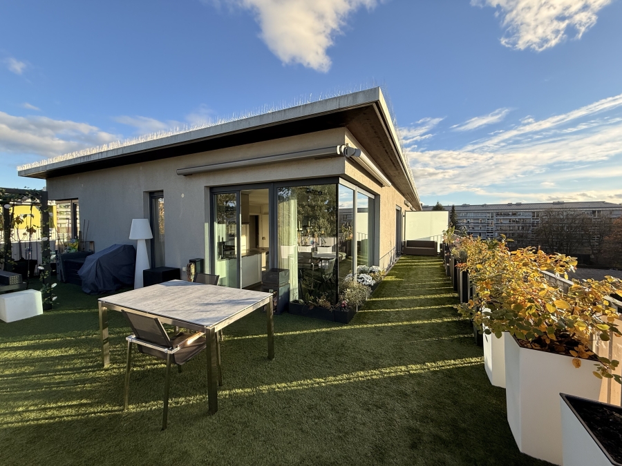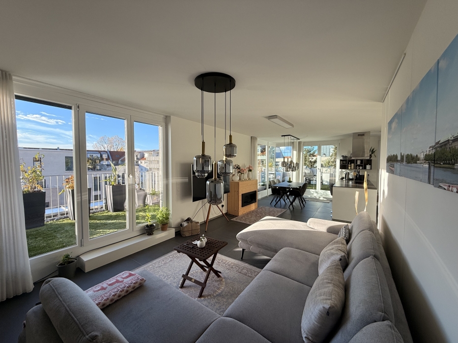 Diese außergewöhnliche Wohnung überzeugt durch ihre traumhafte Dachterrasse, mit Süd-Westausrichtung und ihrem großen, offenen Wohn-Essbereich mit hochwertiger Marken-Einbauküche. Der sonnige, lichtdurchflutete Wohnbereich besticht durch große, bodentiefe Fensterfronten.