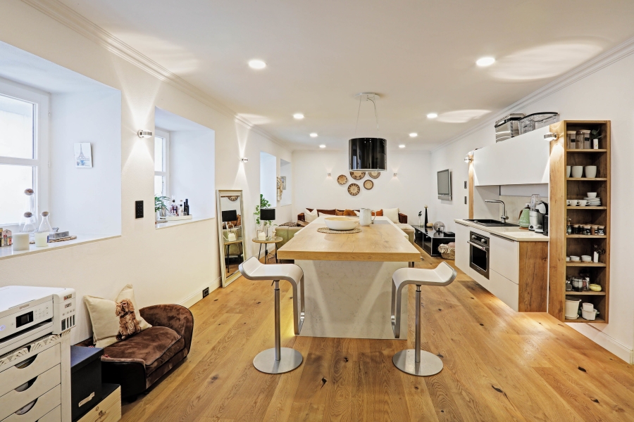 Die exklusive Schreiner-Einbauküche, mit Kochinsel und Esstheke aus massivem Eichenholz, wurde perfekt in den großen Wohnraum integriert.